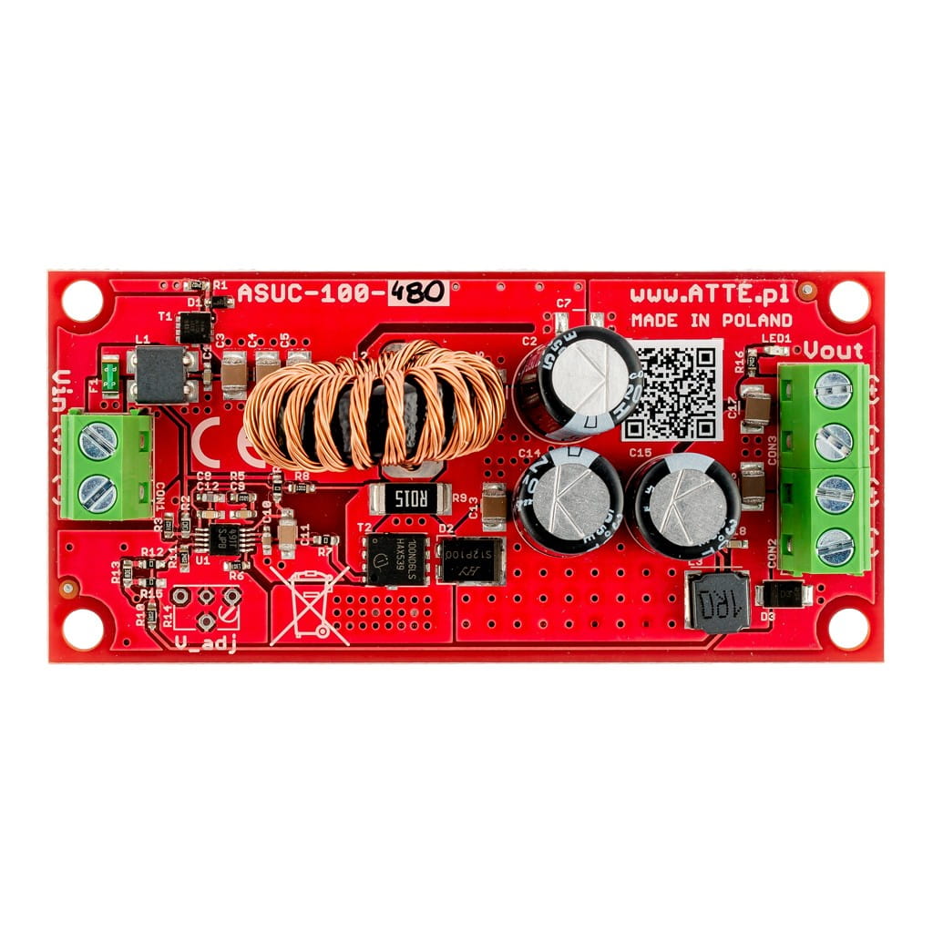 ASUC-100-480-OF to wysokosprawna, nieizolowana przetwornica DC/DC podnosząca napięcie. Przetwornica pozwala na pracę w szerokim zakresie napięć wejściowych i posiada ustalone napięcie wyjściowe 48 VDC. Typowym zastosowaniem modułu jest wytwarzanie napięcia zasilającego PoE 48VDC z napięcia 12 VDC lub 24 VDC pochodzącego z zasilacza buforowego.